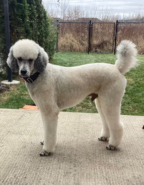 Le premier mâle reproducteur de mon programme m’est arrivé directement de la Floride. Étant une amoureuse des caniches multicolores, cette opportunité d’ajouter un beau sable à mon programme me rendait plus qu’heureuse. Elliott était un chiot plein d’énergie, toujours prêt à jouer, courir et faire le fou avec le reste de la meute. Il est très intelligent et a appris tous les commandements de base en un temps record. C’est un gros « lover » qui ne vit que pour se faire cajoler, caresser et aimer; une chance que mes beaux-parents sont à leur retraite! Ils ont donc beaucoup de temps pour le flatouiller. Bien que n’étant pas élevé avec des enfants, il les adore au plus haut point et se comporte toujours de manière exemplaire avec mon petit neveu. Originaire de la Floride, son amour pour l’hiver et la neige m’a toujours grandement fait rire. Il a une magnifique structure carrée qui, je l’espère, sera transmise à sa progéniture. Ce beau grand garçon pèse 60 livres et fait 25 pouces un garrot.